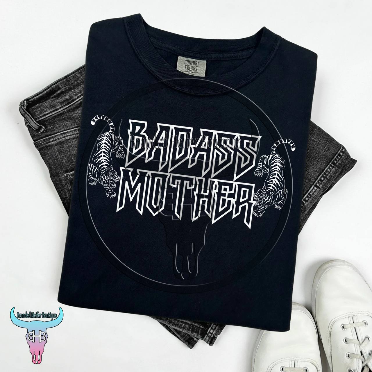 Show the world who’s in charge with the "Badass Mother" T-Shirt. This fierce design features bold, metal-inspired lettering with two striking tigers flanking the words, adding an extra edge to this already powerful statement. Perfect for moms who do it all and aren’t afraid to let their strength shine, this tee is a tribute to the unstoppable energy and attitude that comes with being a badass mother. Wear it proudly and let everyone know you’re not just any mom—you’re a badass mother. Available in two colors: Mint and Black.