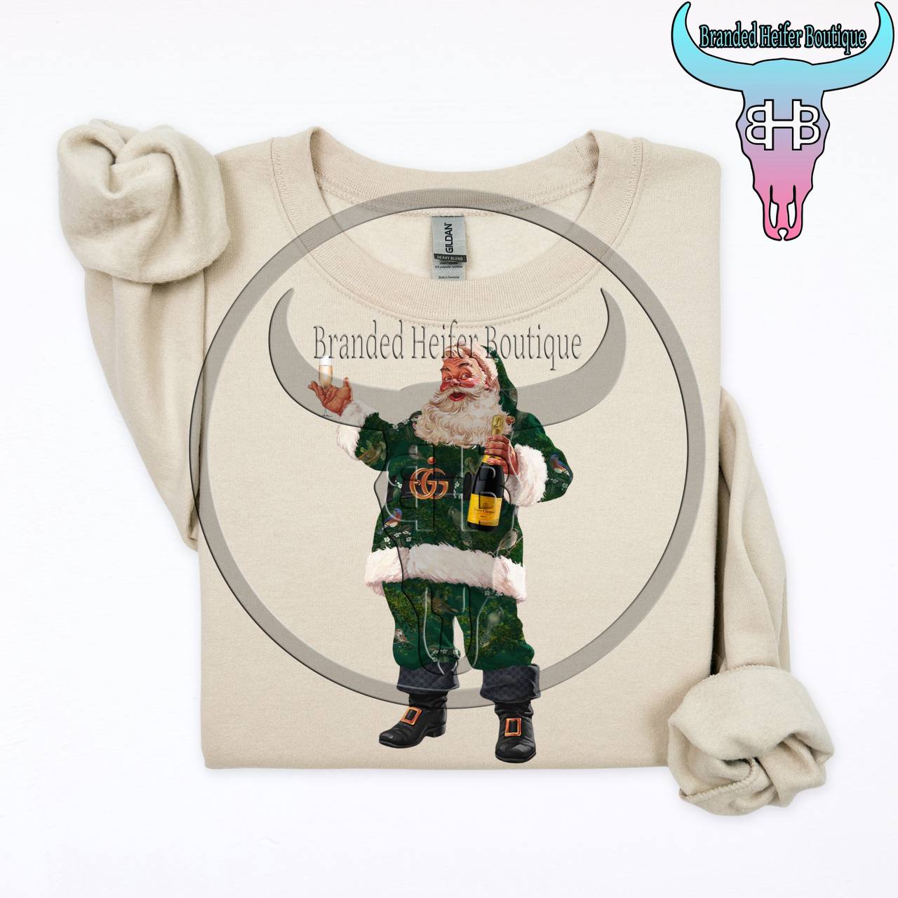 Pop the bubbly, y’all — Santa’s gone glam! Our Boujee Santa Crewneck brings holiday luxury with a Western edge, featuring Santa decked out in rich green designer print holding a champagne toast. Cozy, bold, and full of personality, it’s perfect for Christmas parties, girls’ nights, or anyone who likes their Western with a splash of boujee.