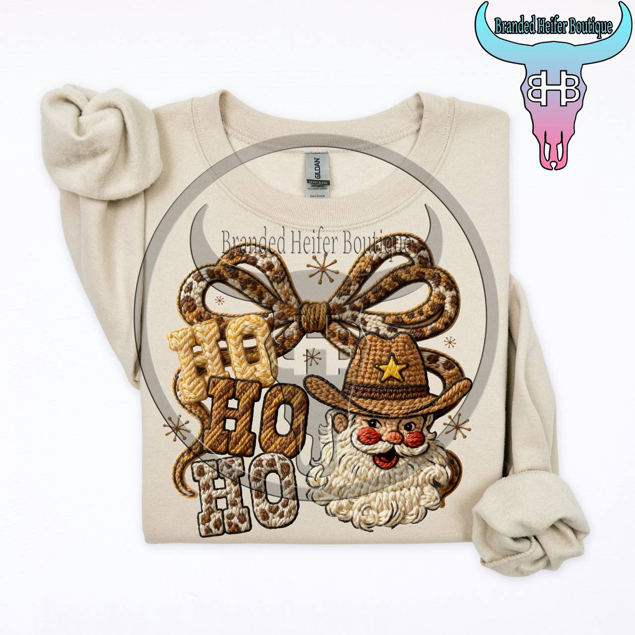 Santa’s gone country and we’re here for it! The Cowboy Claus Crewneck brings cozy comfort with a bold Western twist — featuring Santa in his cowboy hat, rope-styled Ho Ho Ho lettering, and a leopard-print bow for that extra flair. Perfect for chilly nights, holiday markets, or rodeo Christmas parties, this crewneck is merry with a side of outlaw energy.