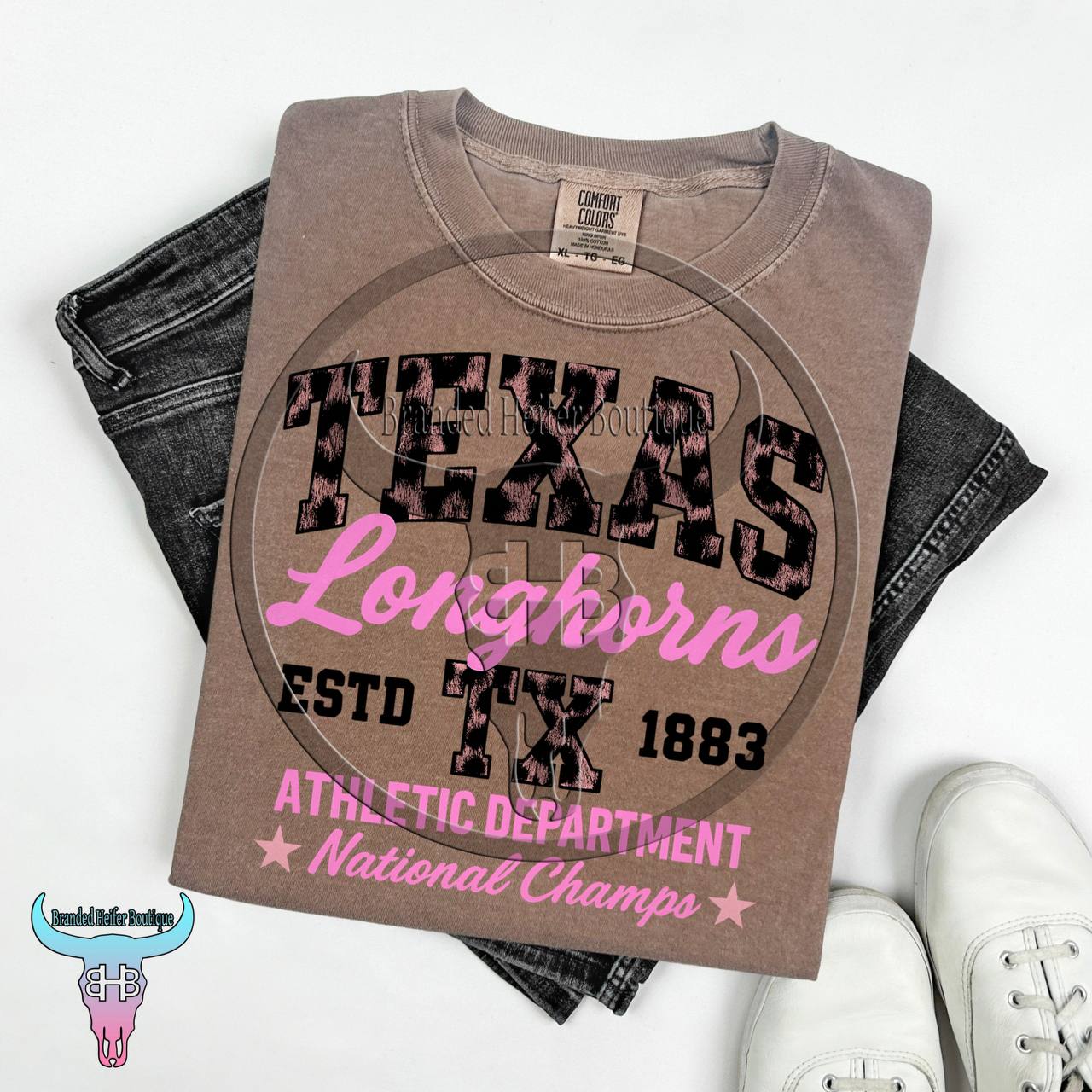 🤘 Whether you're cheering in the stands or repping Texas pride on the daily, the Hook 'Em Longhorns T-Shirt brings the heat with a punch of pink and a western edge. Featuring bold leopard block lettering and retro athletic department details, this tee is made for fans who love their school spirit with a boutique twist.