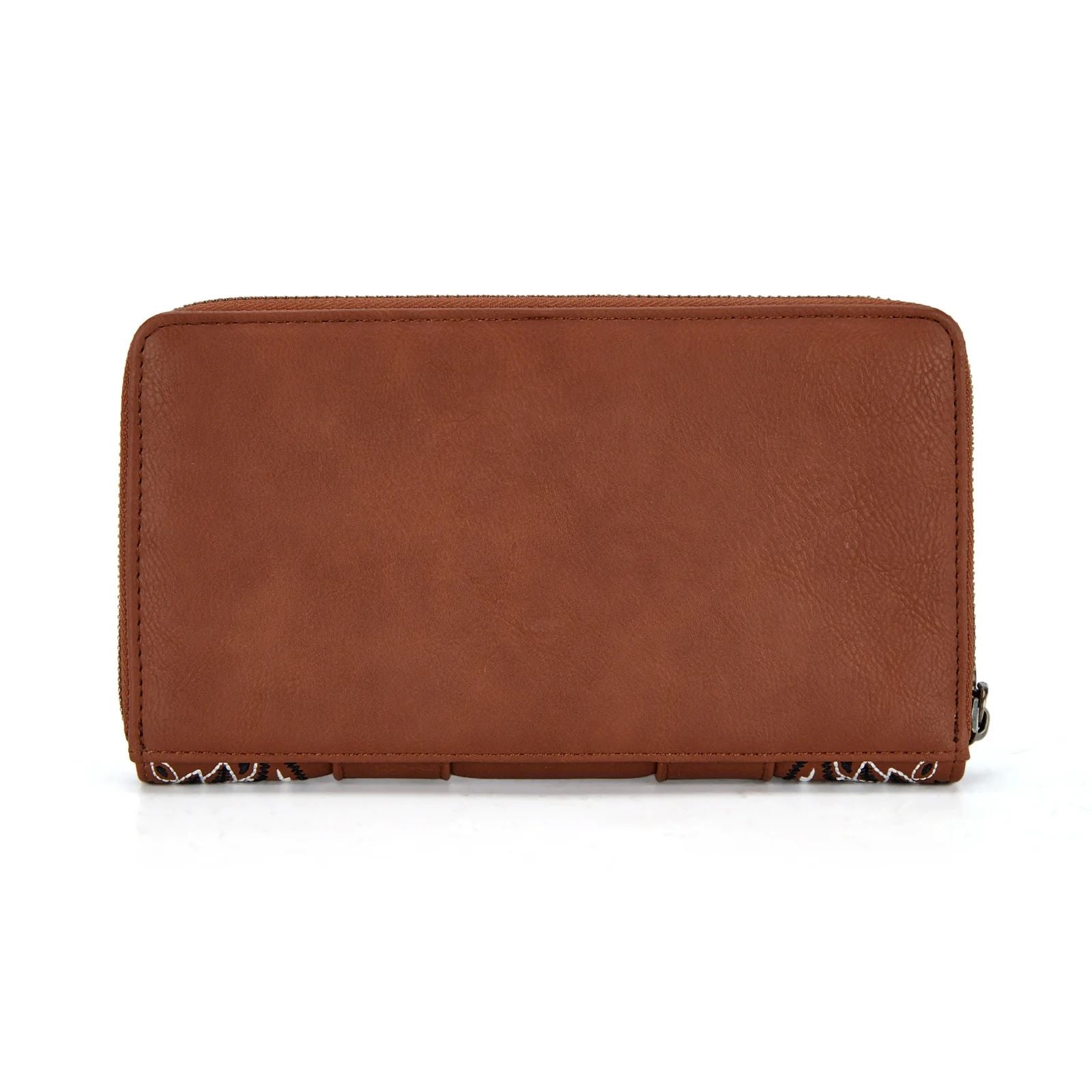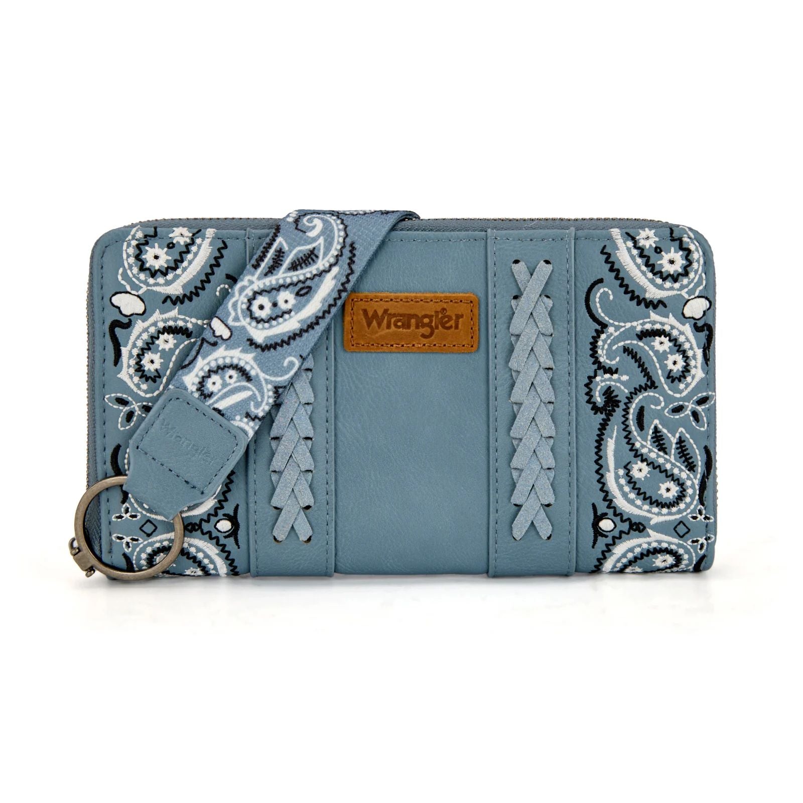 Featuring embroidered paisley panels accented with western-inspired whipstitch detailing, the Wrangler Bandana Paisley Print Wallet brings bold western style to everyday organization. Finished with a signature Wrangler® logo applique on the front, this wallet easily converts to a wristlet for on-the-go convenience.