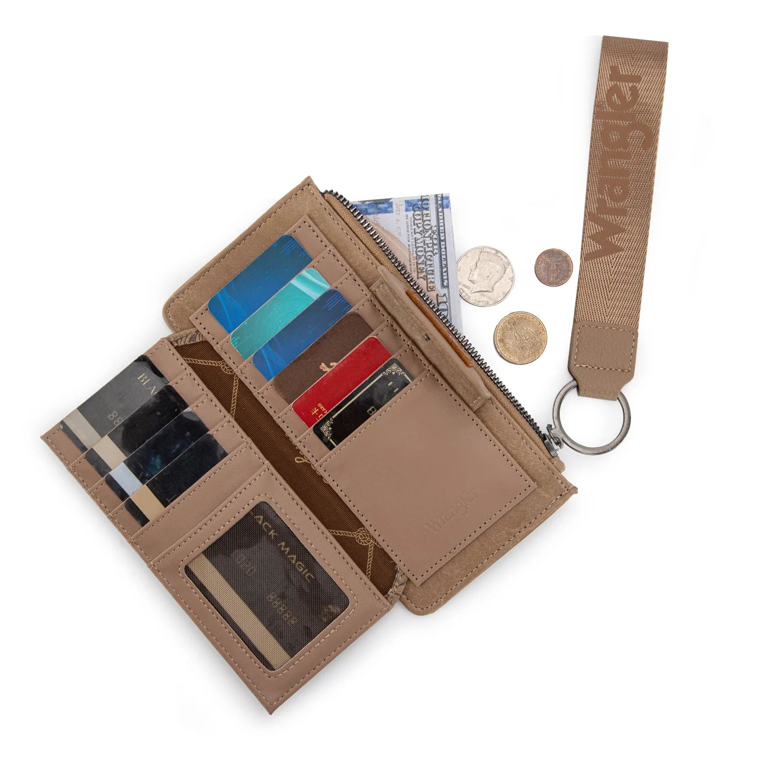 The Wrangler Floral Tooled Card Wallet/Wristlet blends timeless western charm with modern functionality. Crafted from durable PU leather, this elegant piece features detailed floral tooling and the signature Wrangler logo — perfect for those who love vintage-inspired style with everyday practicality.